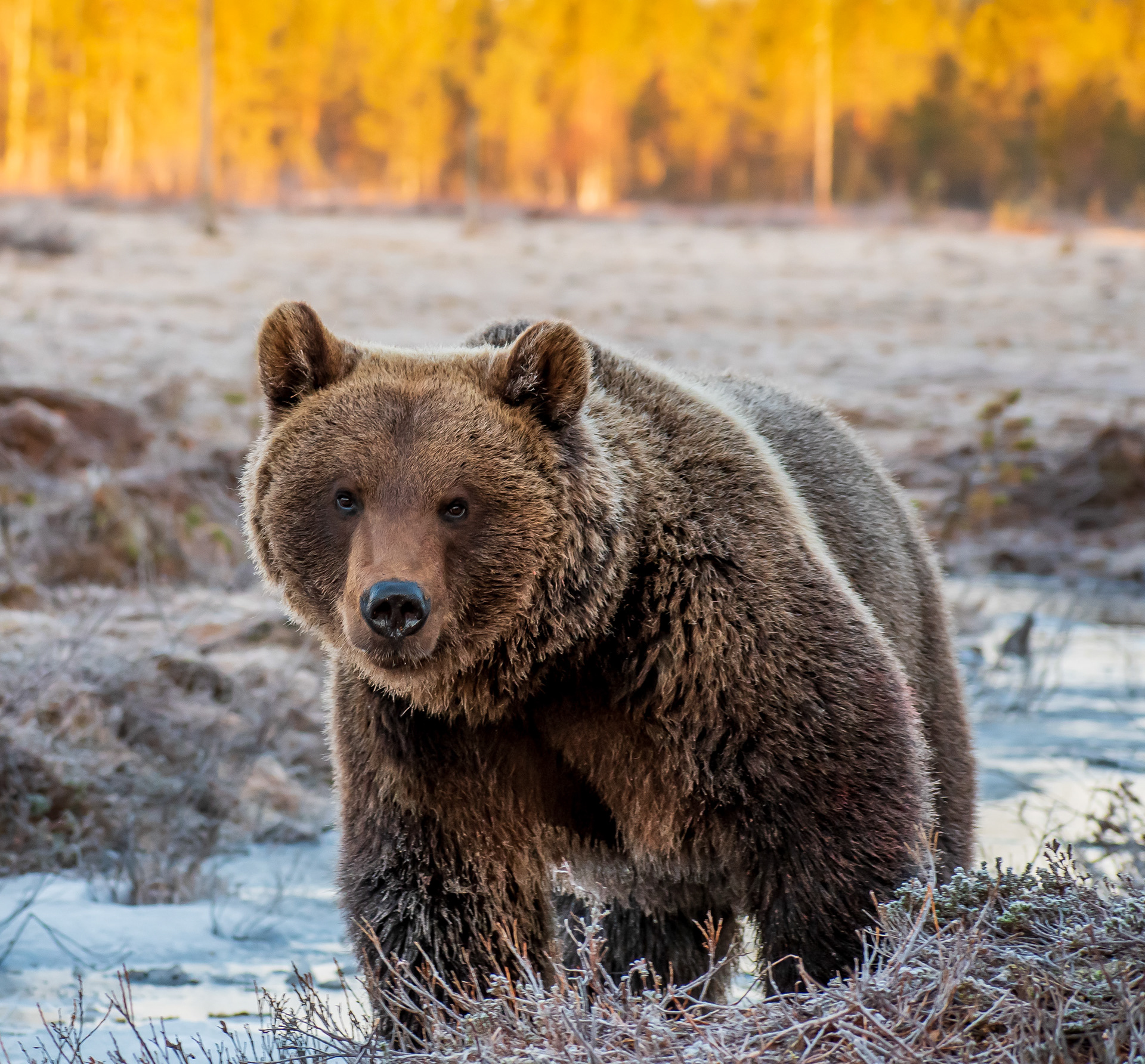 I de første mange timer skete der ikke meget, men om morgenen, et par timer før daggry, kunne jeg høre dyr – bjørne – udenfor. Og med det første lys kunne jeg ane det mørke, enorme omrids af bjørnene. En af dem gik rundt om fotoskjulet, ret tæt på – og da solen stod op, fik jeg det billede, jeg var kommet for. Og nej, jeg var ikke bange for bjørnene, selvom de var så tæt på, at jeg næsten kunne røre dem.