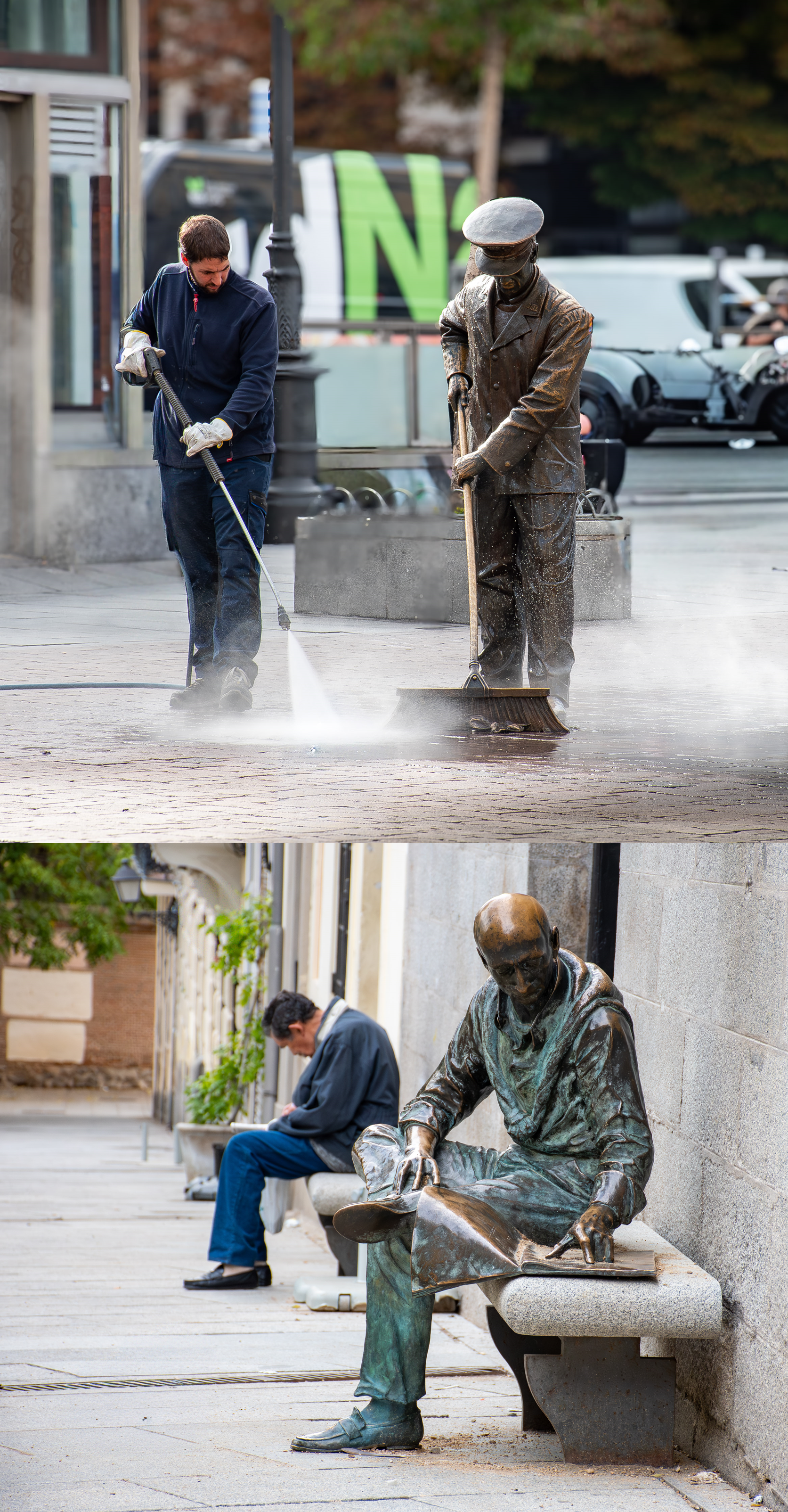 When photographing Madrid's street sweeper, one easily gets trapped into taking a touristic photo. When I visited the square, fortunately, there was a modern street sweeper with a pressure washer working on the edge of the square, and I thought that would make a nice contrast between then and now. Consequently, I sat down patiently waiting for the street sweeper to approach the statue. And click. I got it. The right angle and with the whirling water drops creating action.